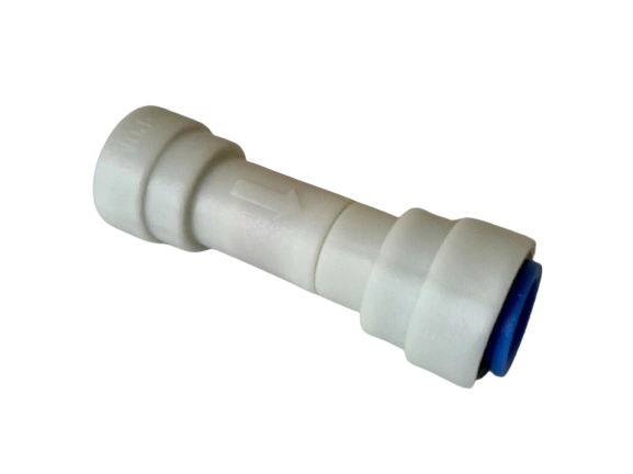 Inline single check valve for push-fit connection to 12mm O/Dia semi-rigid water pipe. 12mm Female x 12mm Female Push Fit Genuine Truma Valve. Truma single check valves prevent backflow and back siphonage, with options for different fluid category risks. Suitable for potable water, foodstuffs (including beer, beverage and soft drinks), hot water, and water treatment and purification. Made from acetal plastic, Truma push-fit check valves can be used on hot or cold pipework.