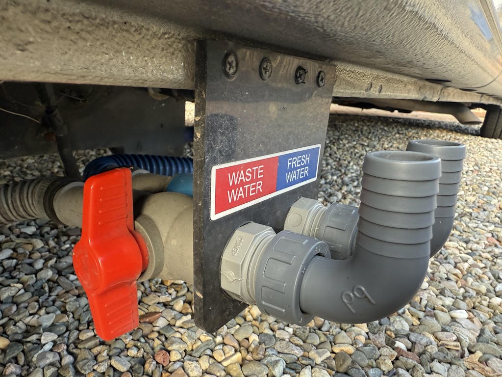 This product is specially designed to streamline the installation process and make operating it more convenient. It is meant to be directly attached to the vehicle's sill, replacing the existing taps. The unit features 1" (25mm) PVC valves that provide increased flow, ensuring a quick disposal of waste and fresh water. The backplate is made of sturdy 6mm black polypropylene and measures 120mm in width and 130mm in height. The fittings at the rear are designed to fit the original 28mm plastic pipe used by the V-Line, although it may require trimming.